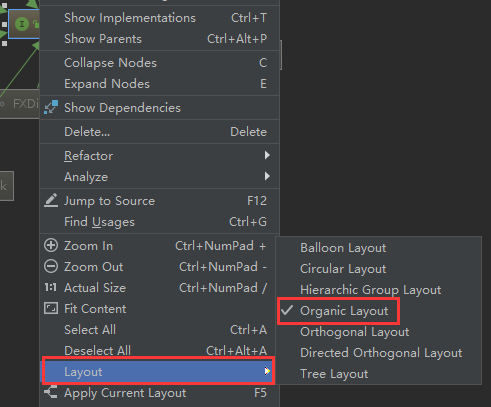 默认的子类层级关系图看不清,这里,可以通过IDEA右键Callable接口,选择“Layout”来指定Callable接口的实现类图的不同结构,如下所示。